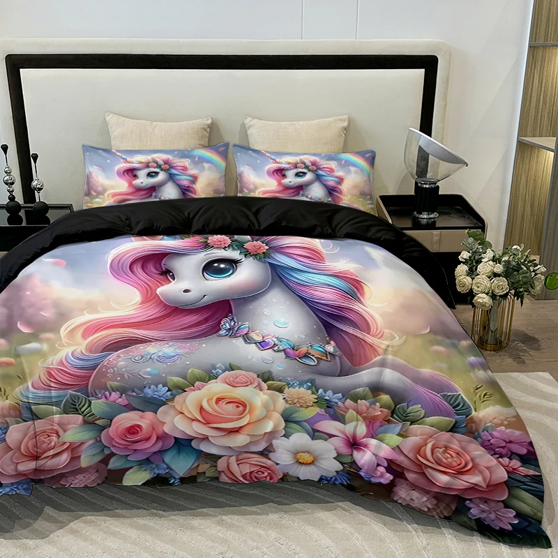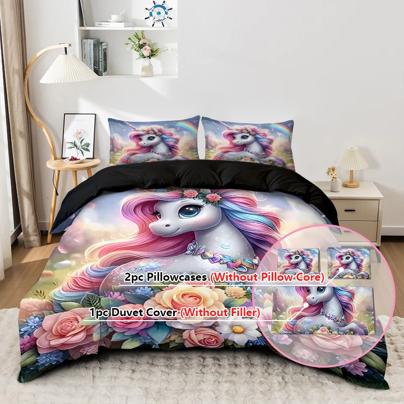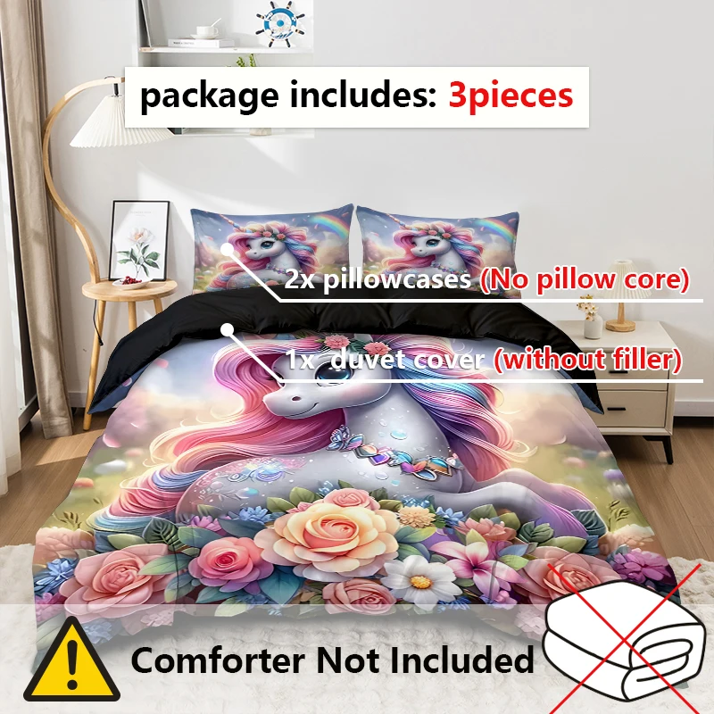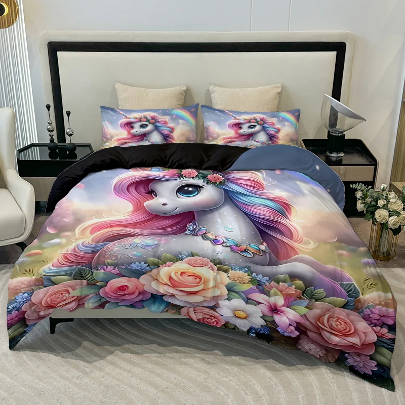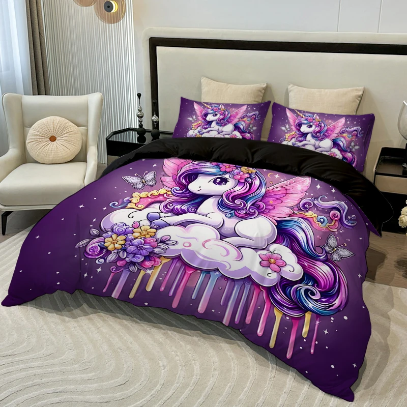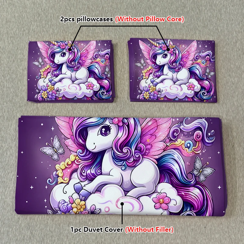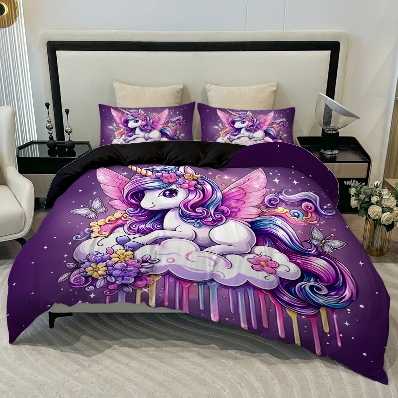 3PC Cartoon Unicorn Comfortable Bedding Set (1Duvet Cover+2Two Pillowcases) Polyester Fiber 3D Digital Printing